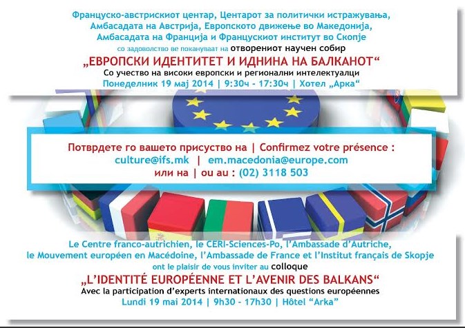 Француско-австрискиот центар, Центарот за политички истражувања, Амбасадата на Австрија, Европското движење во Македонија, Амбасадата на Франција и Францускиот институт во Скопје имаат чест да ве поканат на меѓународниот научен собир насловен како „Европски идентитет и иднина […]