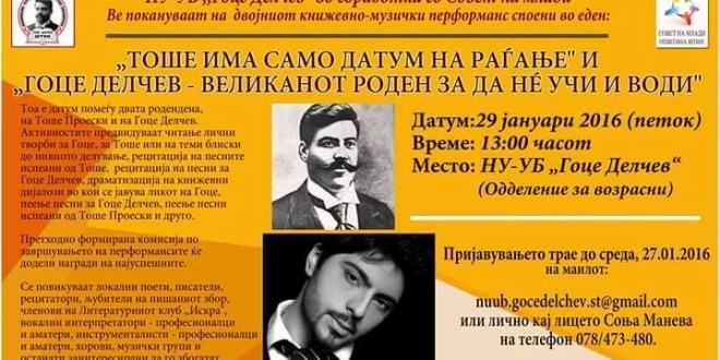 НУ-УБ „Гоце Делчев“ во соработка со Совет на млади денес организираат два книжевно-музички перформанси во еден: „Тоше има само датум на раѓање“ и „Гоце Делчев – великанот роден за да […]