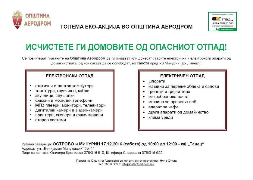 Општина Аеродром во соработка со Друштвото за управување со отпад „Нула отпад“, во сабота, 17.12.2016 година, ќе реализира еко-акција за собирање електронски и електричен отпад, во урбаните заедници „Острово“ и […]