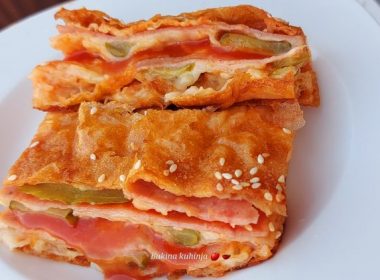 Ви треба: 3 јајца200 мл јогурт500 мл масло200 гр шунка за пица150 гр листови сирењекечапориганопотенки кори1 лажица брашно1 лажица гризкисели краставички Подготовка: Јајцата се матат, се додава маслото, јогуртот и […]