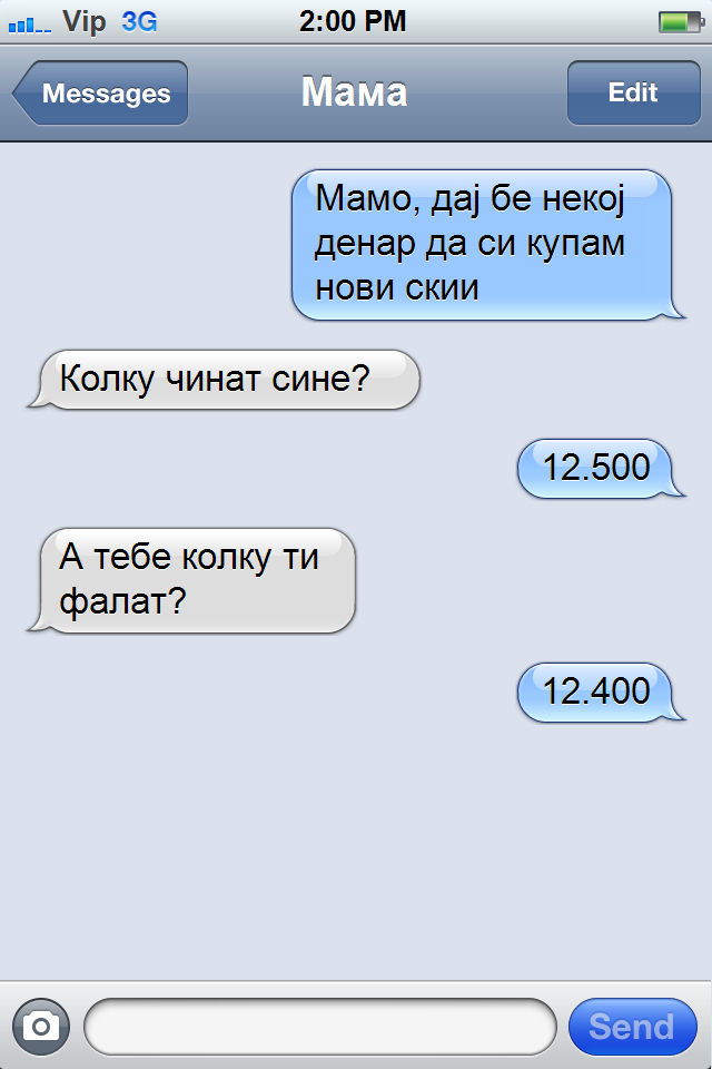 Мамо, дај бе додај ми некој денар да си купам нови скии…