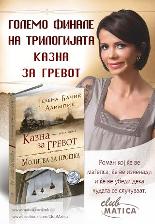 Скопје (14.06.2016) Клубот Матица, на Булеварот на Книгите, во вторник (14 јуни) своите членови и читатели ќе ги почести со присуство на најчитаната балканска авторка Јелена бачиќ Алимпиќ. Поводот за нејзиното гостување е излегувањето од печат на последната книга од трилогијата „Казна за гревот“, „Молитва за прошка“.