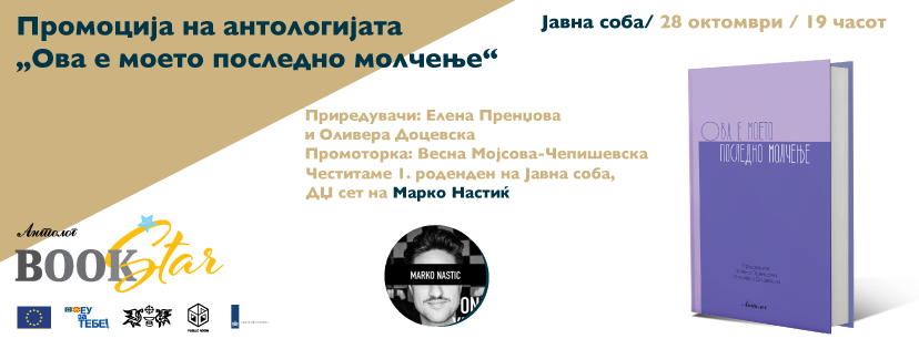 Организацискиот тим на Фестивалот на европската книжевност „BookStar“со големо задоволство ја најавува промоцијата на антологијата „Ова е моето последно молчење“ со поднаслов „Панорама на актуелни современи македонски поетеси“, која ќе се одржи на 28 октомври 2016 година, со почеток во 19 часот, во Јавна соба. Приредувачки на книгата се Елена Пренџова и Оливера Доцевска, а ќе ја промовира Весна Мојсова-Чепишевска. Книгата е објавена со поддршка на Министерството за култура на Република Македонија.Изненадување на вечерта ќе биде поетското караоке, а забавата продолжува на роденденската собиранка на Јавна соба со ДЏ сетот на Марко Настиќ.