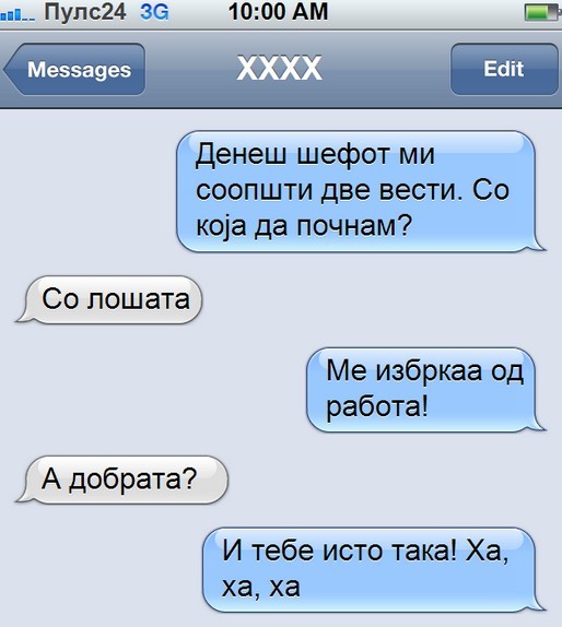 Денес шефот ми соопшти две вести…Е барем си се утеши :))Е барем си се утеши :))