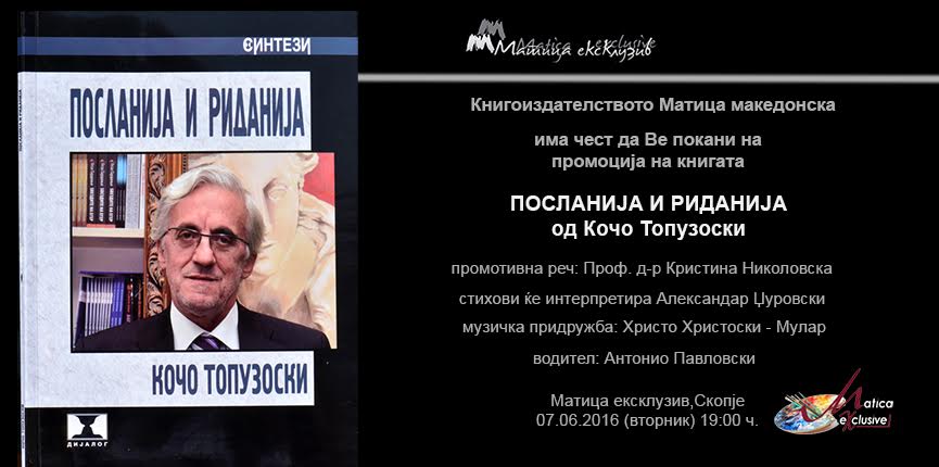 Во мултимедијалниот културен центар „Матица екслузив“,на 7 јуни (вторник) во 19 часот 2016 година ќе се одржи промоција на поетската книга „Посланија и риданија“ од Кочо Топузоски, издание на издавачката куќа „Дијалог“ од Скопје. На страниците од своето најново поетско дело авторот застапува седумдесеттина песни, во кои пее за судбински теми од нашата историја и сегашност.Изданието ќе го промовира проф.д-р Кристина Николовска, а стихови ќе интерпретира артистот Александар Џуровски, со музичка придружба на Христо Христоски-Мулар.