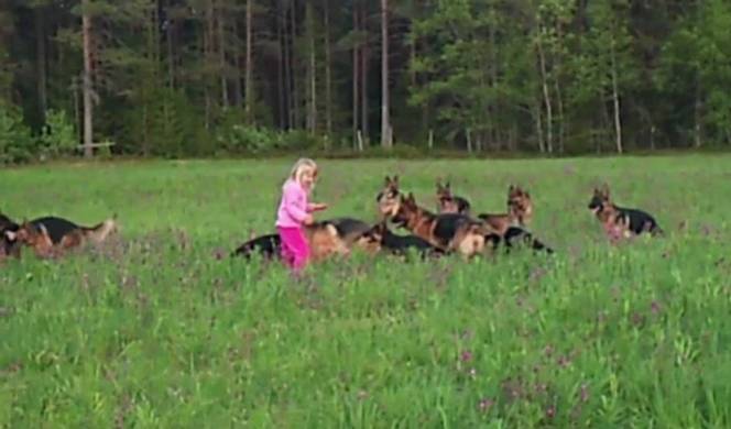 Видео: Девојче на ливада со 14 волчјаци