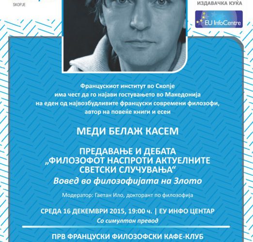 ЧЕТВРТОК 17 ДЕКЕМВРИ 2015, 19:30 ч. | КАФЕ-КНИЖАРНИЦА „МАГОР“ ПРВ ФРАНЦУСКИ ФИЛОЗОФСКИ КАФЕ-КЛУБ „РАЗГОВОР СО МЕДИ БЕЛАЖ КАСЕМ“ (Порта Буњаковец лок. 23).Кариерата ја започнува како романсиер, пред да му се посвети на пишувањето на филозофски дела. По десетгодишна заедничка работа со познатиот францу